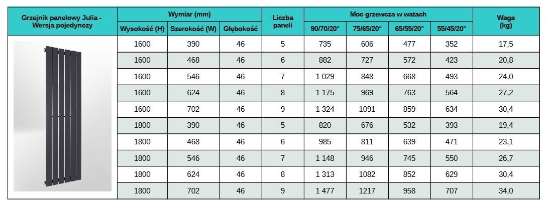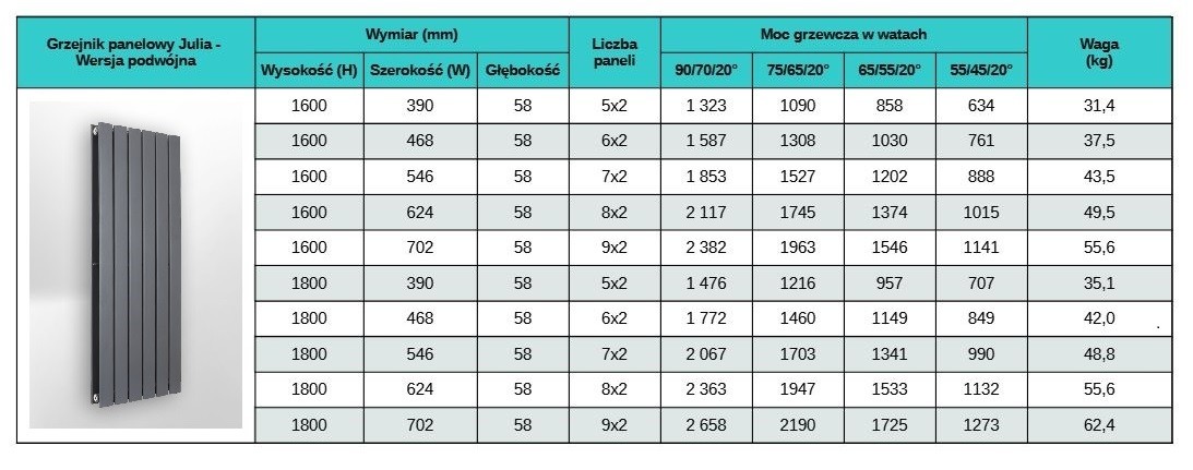 W sklepie dobrygrzejnik.pl przy każdym modelu grzejnika znajdziesz czytelną tabelę mocy, która pokazuje, ile ciepła oddaje grzejnik w zależności od parametrów instalacji. To bardzo ułatwia wybór i pozwala precyzyjnie dobrać grzejnik do indywidualnych potrzeb.