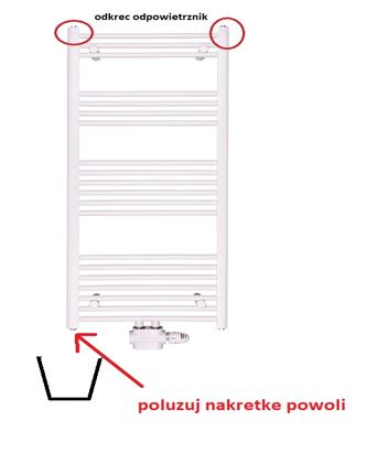 Podstaw wiadro pod grzejnik blisko otworu z ktorego spuscisz wode i odkręć zawór odpowietrzający ktore jest u gory grzejnika po lewej lub prawej stronie. Nastepnie poluzuj bardzo powoli nakretke i spusc wode. To zapobiegnie zalaniu podłogi w łazience.